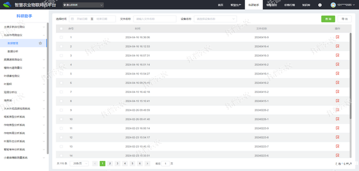 5、数据管理:植物光合作用测定仪支持根据时间范围快速查询数据,可进行查看、上传、导出、删除操作。支持曲线图和表格2种展示形式,按曲线图展示时可双击放大单图查看,便于直观展示数据变化趋势。