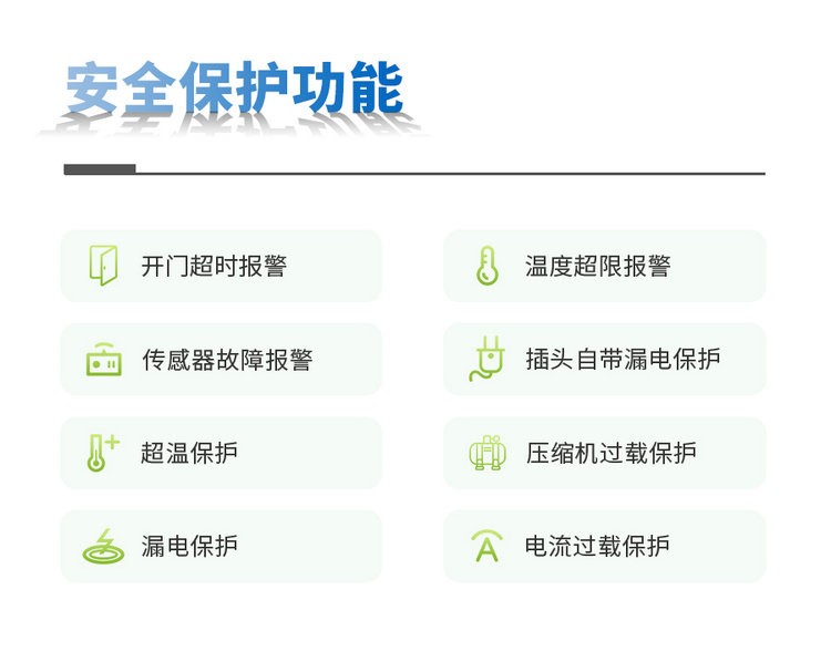 多项安全保护功能:具有开门超时报警、温度超限报警、传感器故障报警、漏电保护、超温保护、压缩机过载保护、电流过载保护等多项安全保护功能,保证仪器和样品的安全。
